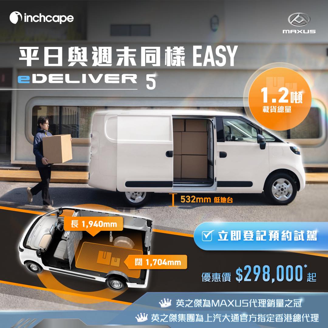 本港商用車市場迎來新挑戰者,MAXUS 近日正式推出全新純電客貨車 eDeliver 5,主打「一車多用」概念,試圖打破傳統客貨車僅限於商業用途的框架。新車不僅強調其高達1.2噸的載貨能力,更引入多項便利配置,旨在同時滿足工商物流業者與家庭用戶的多元需求。